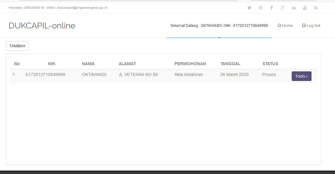 Setelah proses selesai klik Save maka akan tampil halaman seperti gambar dibawah ini, check status proses permohonan saudara/i? akan update sesuai dengan proses yang dilakukan oleh petugas Dukcapil